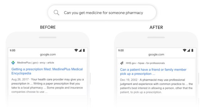 Questa capacità sarà sfruttata dal motore di ricerca per generare con maggiore frequenza SERP con una featured snippet. Google ha dichiarato che ciò avverrà una volta su dieci. L’esempio proposto nel post di Nayak è suggestivo. Immaginiamo che l’utente imposti la sua ricerca con la seguente query: «can you get medicine for someone pharmacy». Dal punto di vista semantico, il problema di Google è comprendere la funzione di «for someone» all’interno della frase. Ecco il risultato della ricerca, rispettivamente senza e con il supporto di BERT: